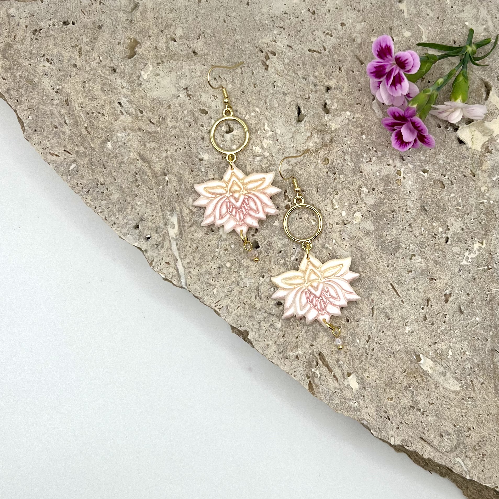 Diese Ohrringe sind ein kleines Kunstwerk: Die handbemalte Lotusblüte in zartem Gold und Rosa verleiht deinem Look eine sanfte, fast magische Ausstrahlung. Der goldene Kreis als Verbindungselement sorgt für eine elegante Form, während die kleine glänzende rosa Perle am unteren Ende das Design verspielt abrundet.